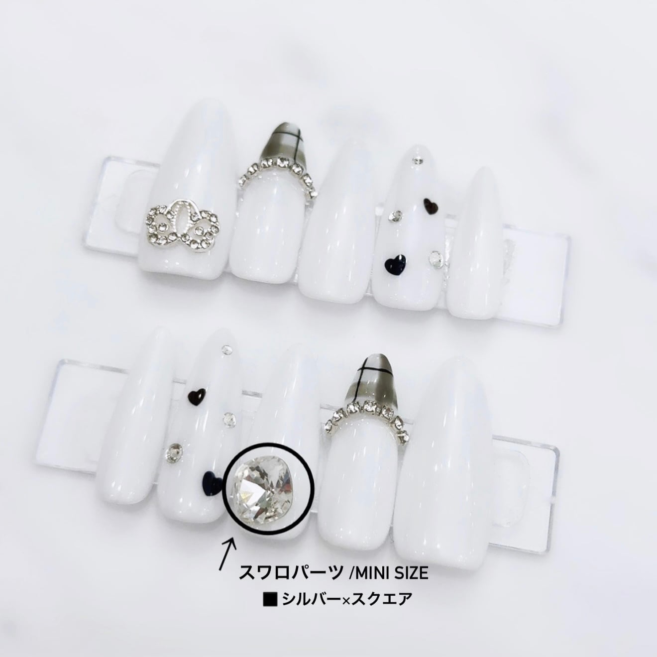 ♥ Lumignon Nail parts♥ ⟡.·パーツ追加 /変更用パーツ⟡.· -ネイルチップといっしょにカートへ追加ください- サロンで大人気なスワロパーツのミニver♡。゚* どのデザインにのせても可愛くときめく・・ 見るたび気分が上がるきらきら具合♪ もっと"きらきら"盛れる欲張り可愛い指先に.. 丁度良いサイズ感です◝✩ ✔︎ Point ・待望のハートorスクエアのスワロミニver ・どんなデザインにもあわせやすい ・選べる3色展開 ✔︎size 約10mm×5mm ✔︎color ¥3色展開 ※画像とあわせてご確認ください ❤︎forme ハート/スクエア ※1個あたりの販売価格です。両手に追加される場合は、左右1本ずつカートに追加してください。 ※単品でのご購入はできません。必ずネイルチップと一緒にカートへ追加してください。 単品のみでご購入いただいた場合は、キャンセル処理をさせていただきますのでご了承ください。 ※同じ爪に複数のパーツ追加 /変更の場合は、カートに商品を追加後、備考欄へ記載ください。内容を確認のうえ、こちらからご連絡させていただく場合がございます ※同じデザインを複数ご購入いただいている場合は、どのカラーにどのパーツを載せるかを、カートに商品を追加後、備考欄へご記載ください。内容を確認のうえ、こちらからご連絡させていただく場合がございます。